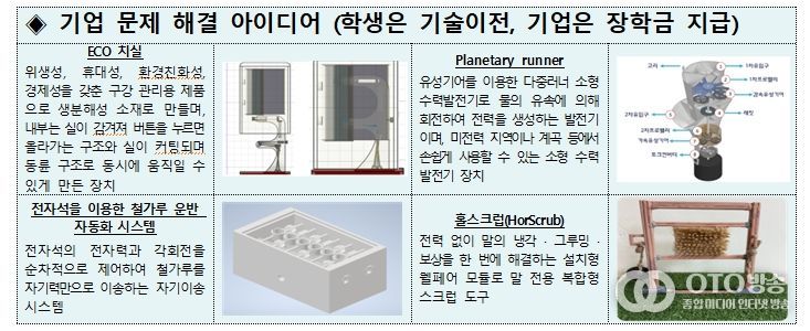 산업현장 과제를 해결한 아이디어 21건은 기업으로 기술이전 되어 활용될 예정으로, 해당 아이디어를 제시한 학생들은 기술 이전료를 장학금으로 지원받게 된다.