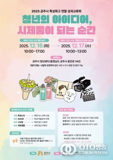 oto방송 김민석 기자 | (재)충남창조경제혁신센터는'2025년 예비청년 특화사업 성장지원(교육특구 시범사업)'의 일환으로 추진 중인 특성화고 창업동아리 프로그램의 성과를 시민들과 공유하기 위해 ‘2025 특성화고 연말 성과교류회’를 12월 16일부터 17일까지 지역 청년센터에서 개최한다고 밝혔다.