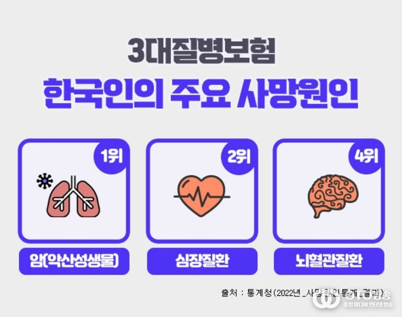 oto방송 김민석 기자 | 흔히 3대질병이라 일컫는 암, 심혈관질환, 뇌혈관질환은 통계청 발표자료에 따르면 한국인의 주요 사망원인 중에서 3위 폐렴을 제외하고 1~4위를 차지하고 있으며, 이전부터 지금까지도 살면서 가장 먼저 대비해야 하는 치명적인 질병으로 강조되고 있다. 이러한 중대질병에 대비하기 위하여 상기 세가지 치명적인 질병을 집중보장하는 3대질병진단비보험을 많이 가입하고 있다. 3대진단비보험은 각각의 질병을 중점적으로 보장하면서도 가입자 특성에 맞는 특약을 추가함으로써 종합건강보험으로도 활용할 수가 있다.