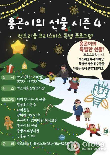 oto방송 김민석 기자 | 시흥시 곤충전시체험관 벅스리움이 크리스마스를 맞아 12월 25일부터 28일까지 ‘흥곤이의 선물’ 시즌4를 운영한다.