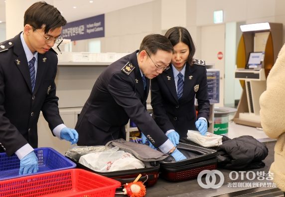 oto방송 김민석 기자 | 관세청은 22일 이명구 관세청장이 인천공항을 찾아, 여행자 휴대품 검사관들과 함께 우범 수하물 선별 및 개장검사, 우범여행자 신체 및 밀리미터파 검색기 운용 등 마약 검사업무를 직접 수행하며 여행자 분야 마약 단속 현장을 점검하고, 지난 5일 발표한 ‘관세청 마약 단속 종합 대책’의 철저한 이행을 주문했다고 밝혔다.