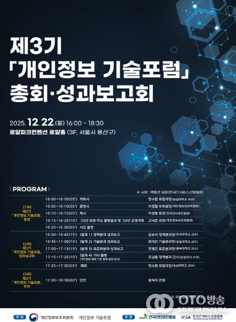 oto방송 김민석 기자 | 개인정보보호위원회는 12월 22일 서울 용산구에서 개인정보 기술개발 활성화 및 산업 생태계 기반 구축을 위한 제3기 '개인정보 기술포럼(의장 정수환 숭실대 교수)' 총회·성과보고회를 개최했다.