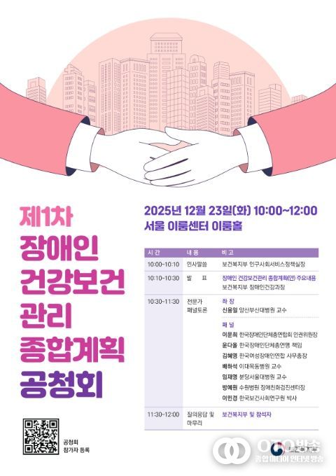 oto방송 김민석 기자 | 보건복지부는 12월 23일 오전 10시 서울 여의도 이룸센터에서 ‘제1차 장애인 건강보건관리 종합계획(안)’에 대한 공청회를 개최했다.