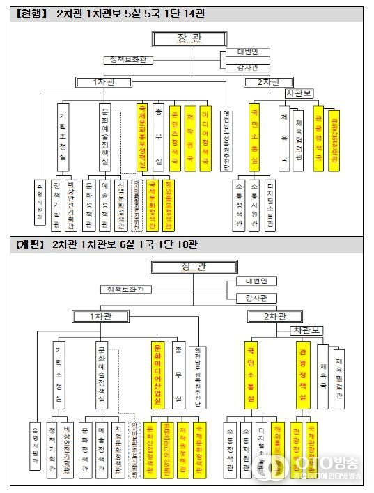 ‘문화미디어산업실’ 내의 콘텐츠정책국과 미디어정책국을 개편해 ‘지식재산(IP)-인력-자금-연구개발(R&D)’ 등 콘텐츠산업의 4대 성장 기반을 중점적으로 지원하는 문화산업정책관을 두고, 미디어·영화·게임·대중음악·출판 등 핵심 분야 지원 기능은 ‘콘텐츠미디어산업관’으로 일원화해 개별 산업 내 쟁점에 대해서도 신속히 대응할 계획이다.