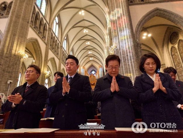 oto방송 김민석 기자 | 이재명 대통령과 김혜경 여사가 25일 서울 중구 명동대성당에서 열린 성탄 대축일 미사에서 기도를 하고 있다.