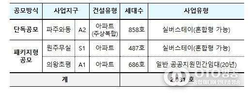 ②택지공모는 약 2천호 규모로 실시하며, 사업 대상지는 파주와동 A2 블록, 원주무실 S1 블록, 의왕초평 A1 블록 총 3곳이다. 파주와동 A2 블록과 원주무실 S1 블록은 실버스테이로, 의왕초평 A1 블록은 임대의무기간이 20년인 일반 공공지원민간임대로 공급한다.