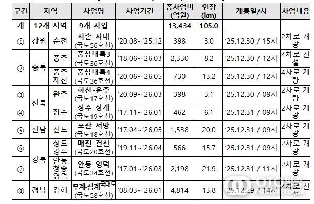 이번에 개통을 앞둔 12개 지역 9개 국도 사업(105km)은 상습 교통정체 완화, 교통사고 예방 및 대중교통 이용성 향상 등을 위해 추진했으며, 사업비는 총 13,434억원을 투입했다.