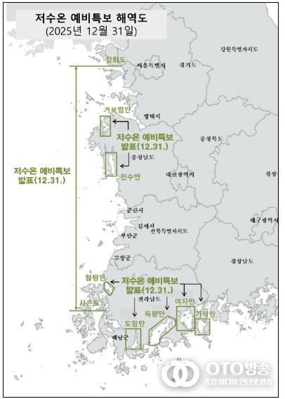 oto방송 김민석 기자 | 해양수산부는 12월 31일 15시부로 저수온 위기경보* ‘주의’ 단계를 발령했다고 밝혔다.