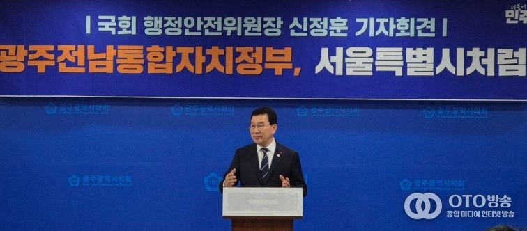 oto방송 김민석 기자 | 신정훈 국회 행정안전위원장은 오늘 광주광역시의회에서 기자회견을 열고 “광주·전남 대통합을 통해 분권형 국가로의 대전환을 이루고, 대한민국 재도약의 길을 열겠다”고 밝혔다.
