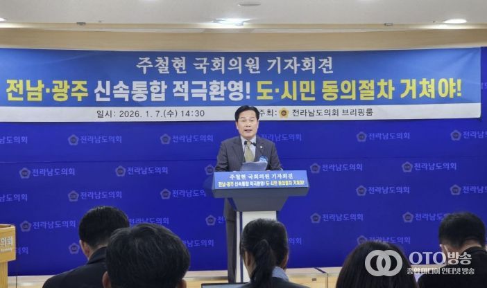 oto방송 김민석 기자 | 주철현 더불어민주당 국회의원(전남 여수시갑)은 7일 오후 2시 30분, 전남도의회 브리핑룸에서 기자회견을 열고, 광주·전남 행정통합에 대한 적극적인 환영 입장과 함께 통합의 방향에 대한 의견과 비전을 밝혔다.