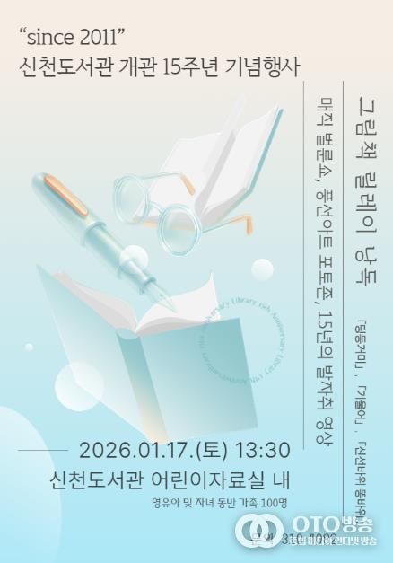 oto방송 김민석 기자 | 시흥시는 오는 1월 17일 신천도서관에서 ‘개관 15주년 기념행사’를 열고, 유아동 및 어린이 동반 가족 100여 명을 대상으로 그림책 낭독과 마술 공연을 운영한다. 행사는 이날 오후 1시 30분부터 3시 30분까지 진행된다.
