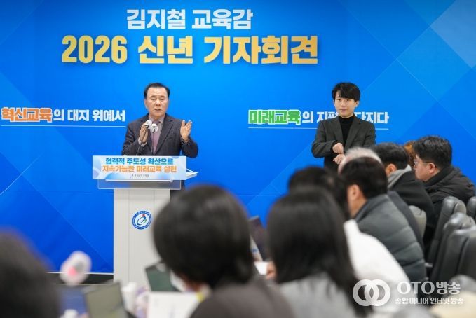 oto방송 김민석 기자 | 김지철 충남교육감은 8일, 도교육청 회의실에서 ‘2026 신년 기자회견’을 열고, ‘2025년 주요 성과와 2026년 12대 중점 추진 과제’를 발표했다.
