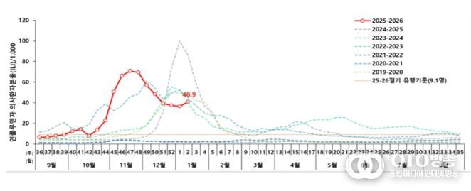 질병관리청에서 운영 중인 표본감시 결과, 의원급 의료기관의 인플루엔자 의사환자 분율은 11월 중순(‘25년 47주차) 이후 감소 추세를 보이다, ’26년 2주차(1.4.~1.10.) 에는 외래환자 1,000명당 40.9명으로 전주(36.4명) 대비 소폭 증가하면서, 이번 절기 유행기준(9.1명)보다 높은 수준으로 유행이 지속되고 있다.