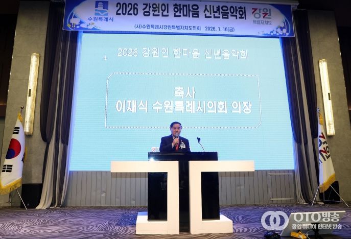 oto방송 김민석 기자 | 수원특례시의회는 1월 16일수원컨벤션센터에서 열린 '2026 강원인 한마음 신년음악회'에 참석했다. 이번 행사는 수원특례시 강원특별자치도민회가 주최한 신년 행사로, 이재식 의장을 비롯한 내빈과 강원 출신 시민 등 약 250여 명이 참석한 가운데 신년음악회, 표창 수여, 만찬 등의 순서로 진행됐다.