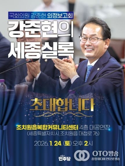 oto방송 김민석 기자 | 더불어민주당 강준현 국회의원(세종시을)이 2026년 1월 24일 오후 2시, 조치원복합커뮤니티센터 대공연장(조치원읍 대첩로 76)에서 의정보고회를 연다.