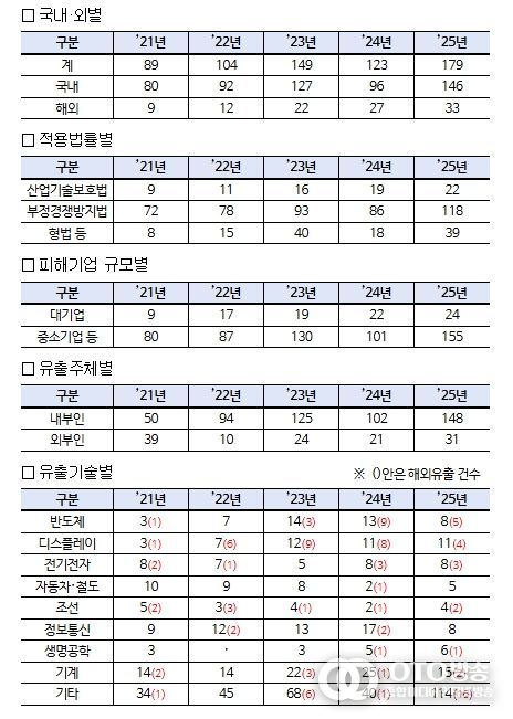 유출 기술별로는 ▵기계(15건, 8.3%) ▵디스플레이(11건, 6.1%) ▵반도체(8건, 4.5%) ▵정보통신(8건, 4.5%) ▵이차전지(8건, 4.5%) ▵생명공학(6건, 3.4%) ▵자동차·철도(5건, 2.8%) 등 순으로 나타났다.