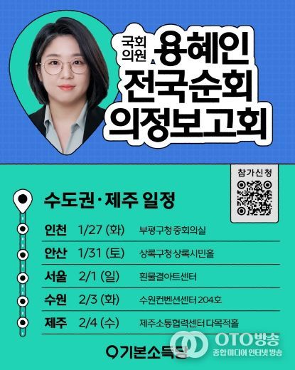 oto방송 김민석 기자 | 기본소득당 용혜인 의원이 오는 1월 27일부터 2월 3일까지 인천광역시, 경기 안산시, 서울특별시, 경기 수원특례시를 차례로 찾아 '국민과 함께 한 걸음 더' 수도권 의정보고회를 연다.