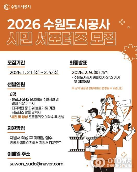 oto방송 김민석 기자 | 수원도시공사가 21일부터 다음 달 4일까지 2026년도 제8기 시민 서포터즈를 모집한다.