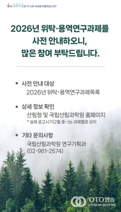 oto방송 김민석 기자 | 산림청 국립산림과학원은 산림 연구 인프라를 내실화하고, 대학 및 연구기관과의 전략적 협업을 확대하기 위해 2026년 위탁·용역연구과제를 사전 안내한다고 밝혔다.