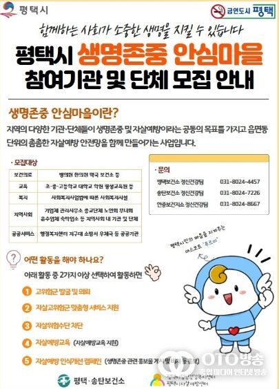 '생명존중 안심마을' 사업에 참여를 희망하는 기관이나 단체는 평택시 정신건강복지센터로 문의하면 된다.