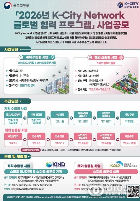 oto방송 김민석 기자 | 정부가 국내 스마트도시 기술의 해외 진출을 지원하기 위해 올해 'K-City 네트워크 글로벌 협력 사업' 공모를 추진한다. 이번 사업을 통해 기업들은 해외 도시에서 자사 기술을 직접 실증하고, 현지 여건에 맞는 사업 모델을 검증해 실제 수주와 사업화로 이어질 수 있는 기회를 얻게 된다.