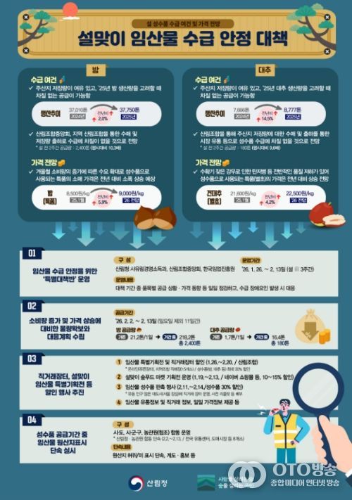 oto방송 김민석 기자 | 산림청은 설 명절을 대비해 대표 임산물인 밤과 대추의 공급에 차질이 없도록 설 연휴 전날인 2월 13일까지 ‘설 성수품(임산물) 수급 안정 대책반’을 운영한다고 29일 밝혔다.
