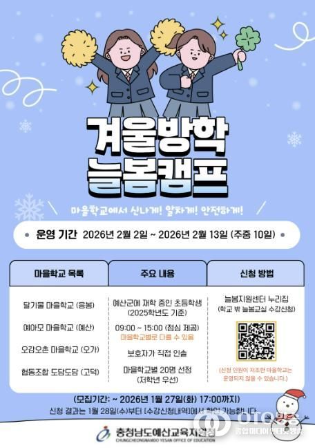해당 늘봄학교는 예산군에 재학 중인 초등학생을 대상으로 2월 3일부터 14일까지 10일간 마을학교 형태로 진행되며, 마을별 특성을 반영한 돌봄·체험 중심 프로그램과 체계적인 안전 관리를 통해 학부모의 돌봄 부담을 덜어줄 계획이다.
