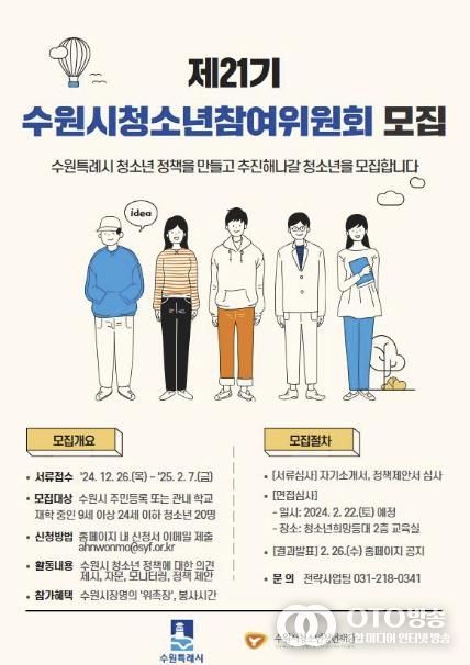 oto방송 김민석 기자 | 수원시청소년청년재단은 청소년들의 사회참여 활성화를 위한 ‘제21기 수원시청소년참여위원회’의 위원을 다음 달 7일까지 모집한다고 밝혔다.