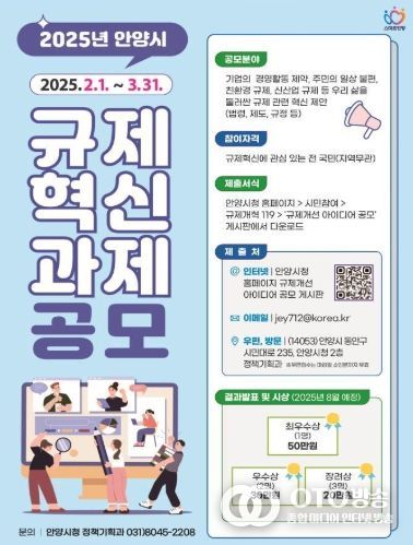 oto방송 김민석 기자 | 안양시는 시민이 직접 참여하고 체감하는 규제혁신 추진을 위해 오는 3월 31일까지 ‘2025년 안양시 규제혁신 공모전’을 개최한다고 4일 밝혔다.