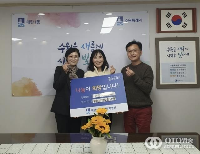 oto방송 김민석 기자 | 지난 1일 수원시 영통구에 위치한 송이비인후과의원는 매 분기 저소득 가정이 안정된 삶을 유지할 수 있도록 매탄1동 행정복지센터에 현금 50만 원을 정기적으로 후원하고 있다.