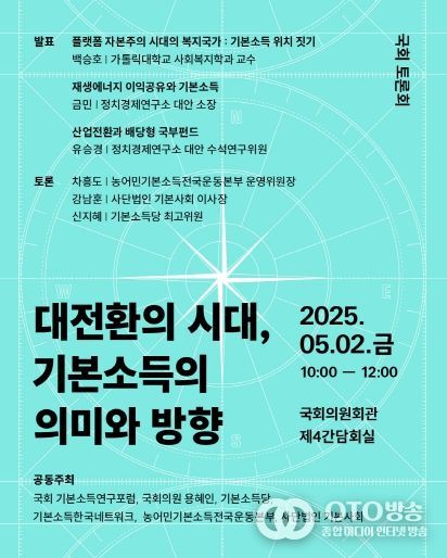oto방송 김민석 기자 | 국회기본소득연구포럼, (사)기본사회, 기본소득한국네트워크 등 정치권 안팎의 기본소득 운동진영이 조기대선을 앞두고 한자리에서 모인다. 5월 2일, 오전 10시 국회의원회관 제4간담회의실에서 토론회 '대전환의 시대, 기본소득의 의미와 방향'이 개최될 예정이다.