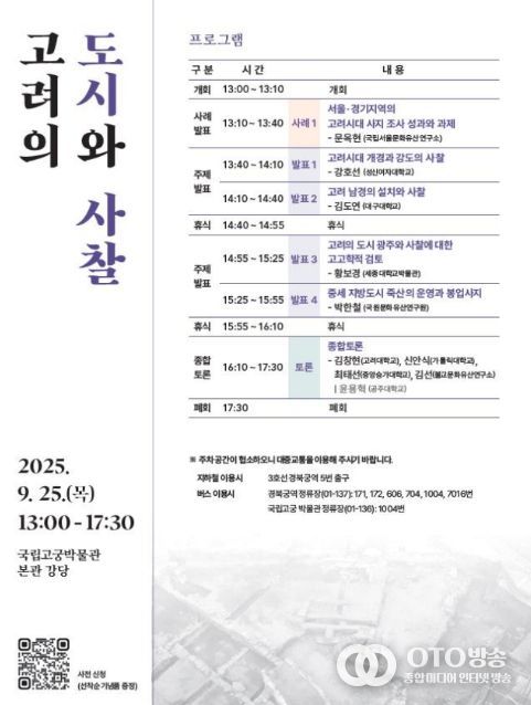 oto방송 김민석 기자 | 국가유산청 국립문화유산연구원 국립서울문화유산연구소는 9월 25일 국립고궁박물관 본관 강당(서울 종로구)에서 ‘고려의 도시와 사찰’을 주제로 '제2차 중세문화포럼'을 개최한다.