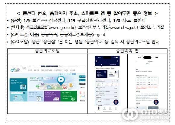 또한 사용자 위치를 중심으로 병‧의원, 달빛어린이병원, 응급실 등의 진료과목, 진료여부 등 의료시설 정보를 제공하며, 연휴 기간에도 문 여는 병‧의원 및 약국 정보를 확인할 수 있다. ‘응급똑똑’앱은 구글 플레이스토어 및 애플 앱스토어에서 검색하면 설치‧이용할 수 있다.