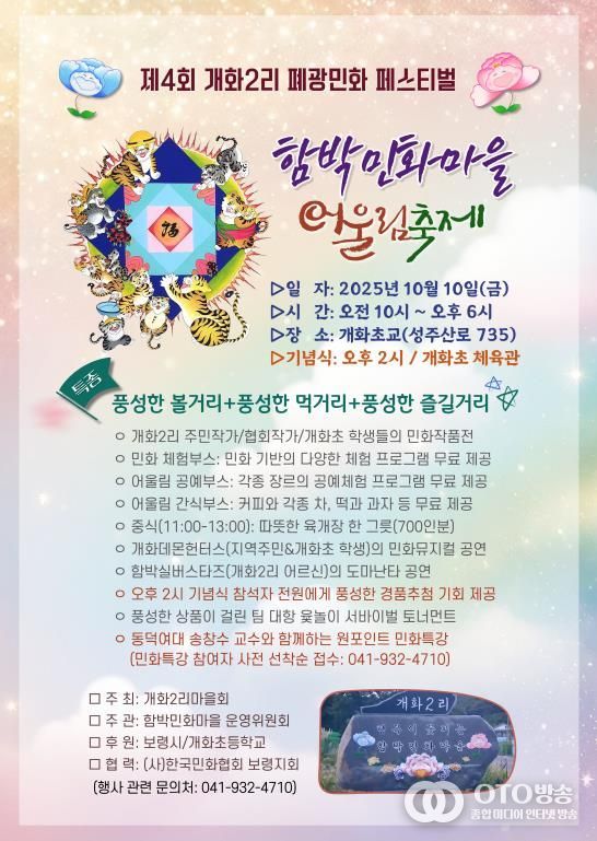 oto방송 김민석 기자 | 보령시는 10일 오전 10시부터 오후 6시까지 개화초등학교에서 제4회 함박민화마을 어울림축제를 개최한다고 밝혔다.