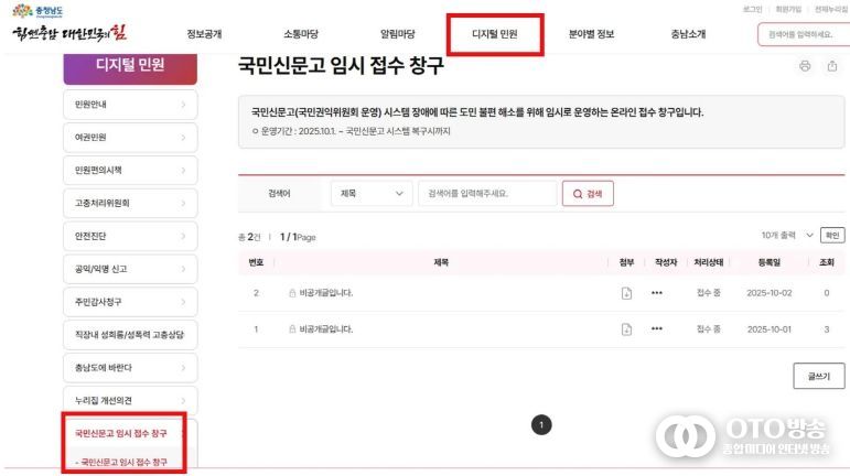 oto방송 김민석 기자 | 충남도는 2일부터 도 누리집에 ‘국민신문고 온라인 임시 접수 창구’를 개설·운영하고 있다고 밝혔다.