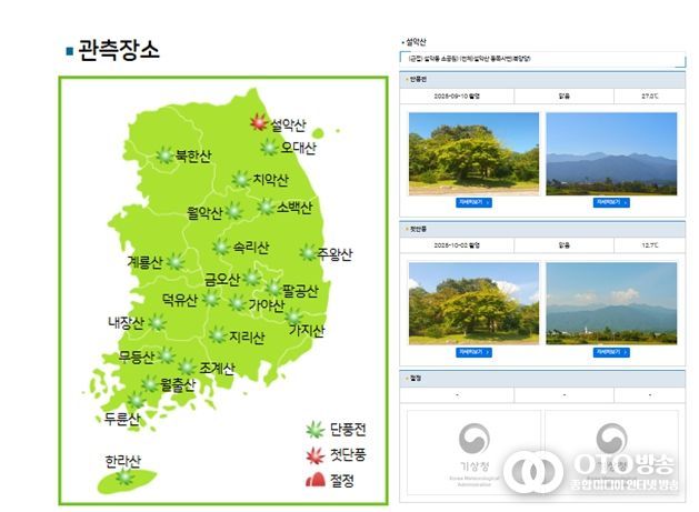 기상청에서는 기상청 날씨누리를 통해 전국 21개 주요 유명산의 단풍현황을 제공하고 있다. 특히 △단풍 전 △단풍 시작 △단풍 절정 시 촬영한 사진을 지도와 함께 제공하여, 누구나 단풍 실황을 살펴볼 수 있다.