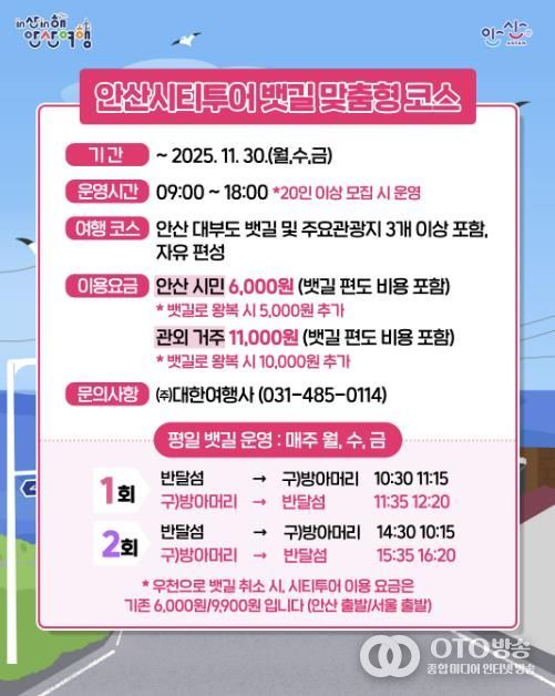 oto방송 김민석 기자 | 안산시는 오는 11월 30일까지 안산시티투어와 안산-대부도 뱃길 사업을 연계한 ‘안산시티투어 뱃길 맞춤형 코스’ 특별이벤트를 운영한다고 10일 밝혔다.