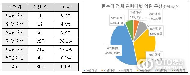 대통령 직속 탄녹위와 지방탄녹위 구성 현황을 출생연대별로 살펴보면, 전체 위원 660명 중 50~70년대생은 575명으로 87.1%를 차지한다. 50년대생(65세~75세)은 6.1%(40명), 60년대생(55세~65세)은 47.0%(310명), 70년대생(45세~55세)은 34.1%(225명)이다. 반면, 80년대생(35세~45세)은 8.3%(55명)이며, 90년대생(25세~35세)은 4.4%(29명)에 그쳤다. 청년 위원은 3.9%(26명)이다. 00년대생은 1명으로, 경상북도 탄녹위 소속이다.