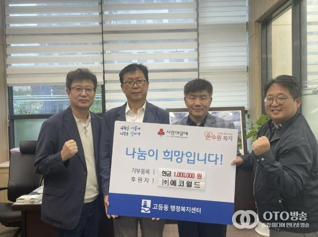 oto방송 김민석 기자 | 수원시 팔달구 고등동은 10월 13일, 사회적기업 ㈜에코월드로부터 관내 취약계층을 위한 이웃돕기 성금 100만원을 전달받았다고 밝혔다.
