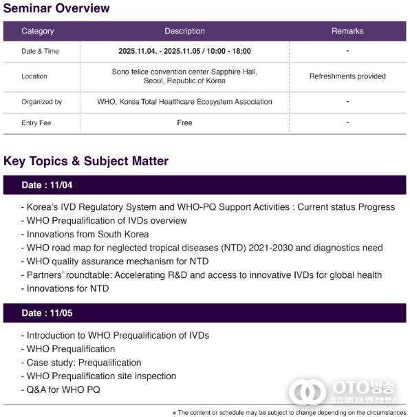 oto방송 김민석 기자 | 식품의약품안전처는 세계보건기구(WHO)의 사전적격성심사(PQ)팀과 공동으로 11월 4일부터 5일까지 서울 소노펠리체 컨벤션센터에서 국내 체외진단의료기기 제조업체의 해외 조달 시장 진출을 지원하기 위한 세미나를 개최한다고 밝혔다.