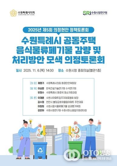 oto방송 김민석 기자 | 수원특례시의회 환경안전위원회는 11월 6일, 오후 2시, 수원시청 별관 1층 중회의실에서 ‘공동주택 음식물류폐기물 감량 및 처리방안 모색을 위한 의정토론회’를 개최한다고 밝혔다.