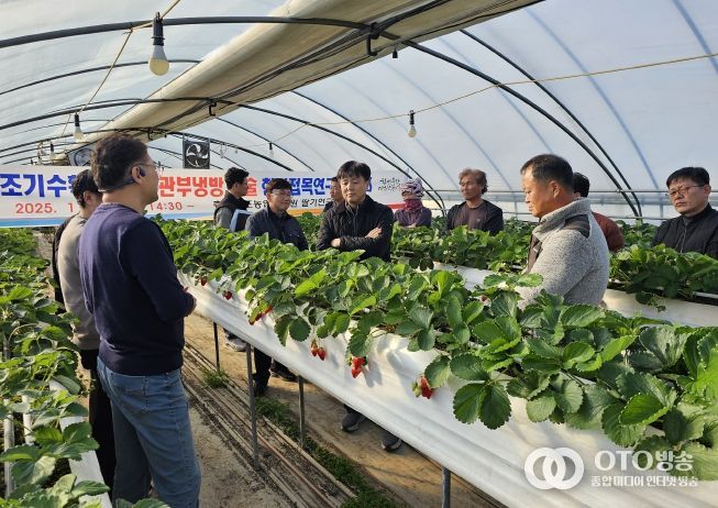 oto방송 김민석 기자 | 충남도 농업기술원은 11일 논산시 현장접목연구 실증농가에서 딸기 농가의 소득증대를 위한 ‘딸기 조기정식 후 관부냉방 기술 현장평가회’를 개최했다.