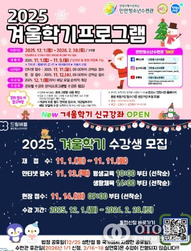oto방송 김민석 기자 | 안양시청소년재단 소속 만안청소년수련관과 동안청소년수련관은 2025년 겨울학기 강좌 수강생을 모집한다고 12일 밝혔다.