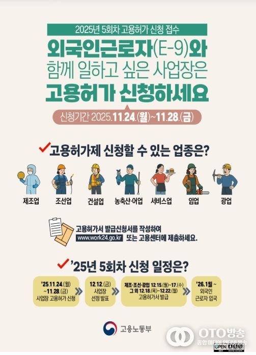 oto방송 김민석 기자 | 고용노동부는 11월 24일부터 11월 28일까지 전국 지방고용노동관서를 통해 외국인근로자(E-9)에 대한 올해 5회차 신규 고용허가 신청을 받는다.