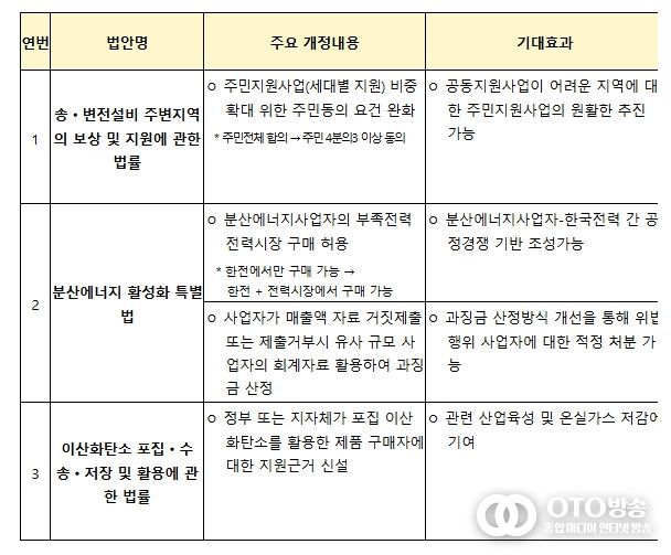 oto방송 김민석 기자 | 기후에너지환경부는 △‘송‧변전설비 주변지역의 보상 및 지원에 관한 법률’, △‘분산에너지 활성화 특별법’ 등 3개 법 개정안이 11월 13일 국회 본회의를 통과했다고 밝혔다. 개정안별 주요내용은 다음과 같다.