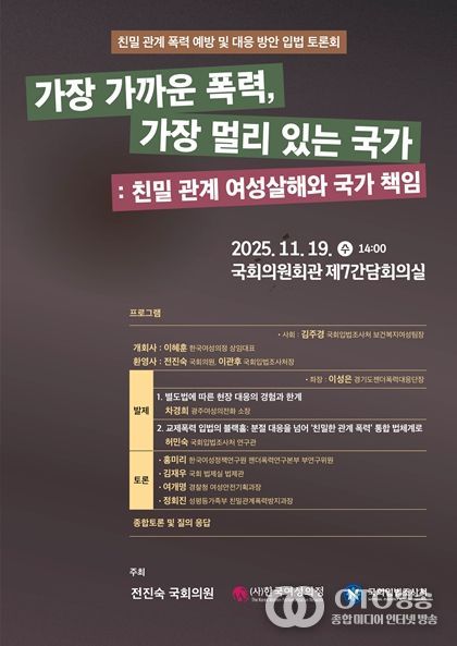 특히 이번 토론회는 여성폭력 대응의 최전선에서 활동해온 한국여성의정과 입법‧정책 분석 전문기관인 국회입법조사처가 공동주최한다는 점에서 의미가 크다. 현장에서 축적된 경험과 국가의 법·제도 설계 기능이 만나, ‘친밀 관계 폭력’ 대응을 실효성 있는 법제 개선으로 연결시키기 위한 첫 공론장으로 평가된다. 전진숙 의원은 “가장 안전해야 할 관계가 가장 위험한 관계가 되어버린 한국 사회의 현실을 더는 외면할 수 없다”라며, “재범·보복폭력·살해로 이어지는 친밀 관계 폭력의 특성을 국가가 제도적으로 파악하고 개입하도록 법 체계를 전면 재설계해야 한다”고 강조했다.