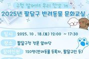 oto방송 김민석 기자 | 수원시 팔달구는 10월 18일 오후 12시부터 17시 30분까지 팔달구청 정문 앞마당에서 ‘2025년 팔달구 반려동물 문화교실’을 개최한다고 밝혔다. 반려동물 문화교실은 성숙한 반려문화 확산과 올바른 반려동물 관리, 양육 방법을 알리기 위해 마련됐으며 반려동물 등록자 및 팔달구민 120명을 대상으로 추진한다. 교육 프로그램은 △인식표 만들기 △산책 그룹 훈련 △반려견 셀프 미용으로 총 3개 프로그램을 추진한다. 12시부터 진행하는 ‘인식표 만들기’는 반려견 유실 방지를 위해 동물등록번호와 견주 연락처를 새긴 맞춤형 인식표를 직접 제작할 수 있고, 14시부터는 ‘산책 그룹 훈련’에서는 산책줄 핸들링과 돌발 상황 시 대처법 등 및 올바른 산책 방법에 대해 배워볼 수 있다. 15시 30분에는 초보자도 쉽게 실천할 수 있는 ‘반려견 셀프 미용 수업’이 준비되어 있다. 팔달구 관계자는 “2025년 반려동물 문화교실 개최를 통해 구민들이 반려동물을 책임감 있게 관리하고, 올바른 반려 문화가 조성되길 바란다“라고 말했다. 한편, 팔달구는 구 홈페이지, 안내문자 및 QR코드