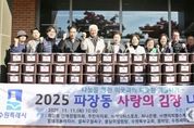 oto방송 김민석 기자 | 수원시 장안구 파장동 새마을부녀회는 11일, 지역 주민들과 함께 ‘사랑의 김장 나누기’ 행사를 열고 따뜻한 정을 나눴다. 이번 행사에서 새마을부녀회는 직접 김장을 하고 정성껏 포장해 기초생활수급자, 독거노인, 취약계층 250가구에 전달했다. 정성스럽게 준비된 김치는 겨울철 이웃들의 식탁에 온기를 더해줄 예정이다. 박용희 파장동 새마을부녀회장은 “김장은 단순한 음식 장만이 아닌 정성과 마음이 담긴 겨울 준비”라며 “이웃을 생각하며 함께 담근 김치가 어려운 분들께 따뜻한 위로가 되길 바란다”고 말했다. 장인영 파장동장은 “어려운 이웃을 위해 정성껏 김장을 준비해주신 새마을부녀회와 여러 단체 및 후원해 주신 분들께 감사드리며 파장동의 사랑과 정성이 잘 전달될 수 있도록 하겠다”고 전했다. 파장동은 매년 겨울을 앞두고 김장 나눔 행사를 통해 이웃 간의 온정을 나누고 있으며 올해도 지역 주민들의 자발적인 참여와 후원으로 더욱 풍성한 나눔의 장이 마련될 것으로 기대해 본다.