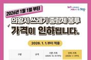 oto방송 김민석 기자 | 의왕시가 물가 상승 및 경기 침체로 인한 시민들의 경제적 부담을 완화하기 위해 2026년 1월 1일부터 쓰레기 종량제봉투 판매가격을 인하한다. 이번 가격 인하 대상은 일반용 및 재사용 종량제봉투이며, ▲5리터 봉투는 190원에서 150원으로 ▲10리터 봉투는 350원에서 300원으로 ▲20리터 봉투는 680원에서 550원으로 인하된다. 또한, ▲50리터 봉투는 1,700원에서 1,400원으로 ▲75리터 봉투는 2,630원에서 2,100원으로 각각 조정된다. 가격 인하 이전에 구매한 종량제봉투는 그대로 사용 가능하고, 음식물 종량제봉투, 공사장 생활폐기물 포대, 대형폐기물 신고필증은 가격 등은 변동 없다. 김성제 시장은 “종량제봉투는 시민 생활과 밀접한 만큼, 이번 가격 인하가 가계 부담 완화에 도움이 되길 바란다”며, “가격 인하 시점이 2026년 1월 1일이므로, 그전까지 각 가정에서 필요한 양만 구입해 주시길 바란다”고 전했다.