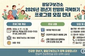 oto방송 김민석 기자 | 수원시 팔달구보건소가 ‘2026년 갱년기 한방에 극복하기’ 프로그램에 참여할 40~60대 지역 여성을 3월 13일까지 모집한다. 신체적·정신적 변화가 큰 갱년기 시기의 중년 여성들이 변화를 긍정적으로 받아들이고 건강하게 대비하도록 돕는 프로그램이다. 선착순으로 25명을 모집한다. 팔달구보건소 1층 한의약건강증진실에 방문하거나 전화(031-5191-0612)로 신청할 수 있다. 무료 프로그램이다. 프로그램은 3월 17일부터 5월 28일까지 팔달구보건소 3층 대강당에서 진행된다. 주요 내용은 ▲체지방 측정·상담 ▲한의약적 접근을 통한 갱년기의 원인·증상·예방법 교육 ▲운동 전문 강사와 함께하는 근력 및 운동 등이다. 팔달구보건소 관계자는 “급격한 호르몬 변화를 겪는 갱년기 여성들을 위해 알찬 프로그램을 준비했다”고 말했다.